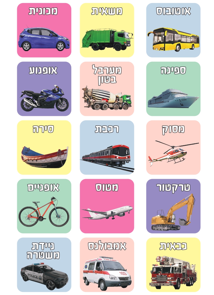 מדבקות צבעוניות מארז של 10 דפים בצורת מרובעים עם ציור של כלי תחבורה