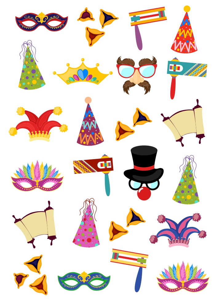 מדבקות צבעוניות בצורות של פורים 10 דפים לגני ילדים